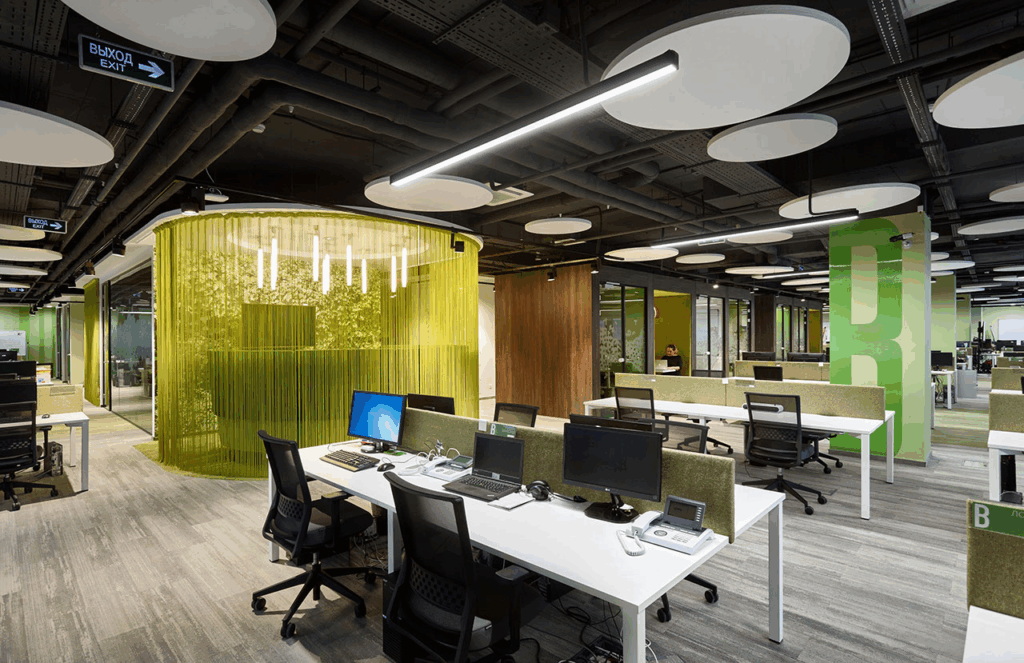 Working in the largest Russian bank requires flexibility – individually selected teams with a variable composition work on specific projects. The architectural challenge was so great that several companies, including the famous Swiss Evolution Design, influenced the shape of the Sberbank headquarters. What is the result? Multifunctional, flexible, diverse space, which covers conference rooms and coworking spaces, as well as enclosed individual boxes. Each of the four floors, that can accommodate approx. 650 people, is divided into zones of various purposes and colours. In the centre there is the main communication spot with a multifunctional conference room, a library, a kitchen and a relaxation area. Workplaces are located along the outer ring of the building, right next to the windows.