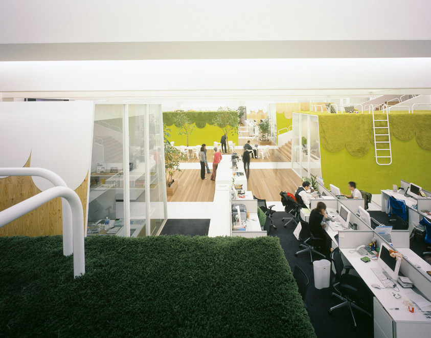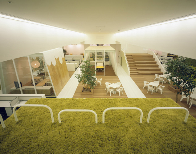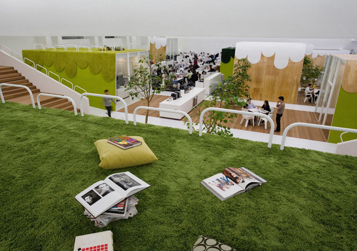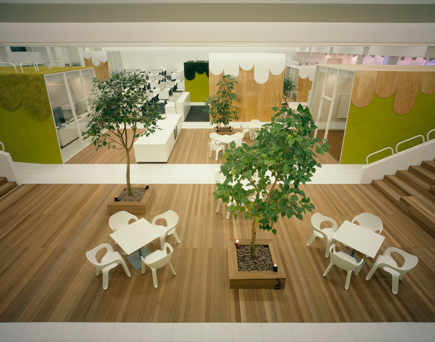 Although the office of the advertising giants was already established in 2007 (in cooperation with Hakuhodo Offices and KDa), the several-year project is still modern and fresh. All thanks to universal solutions and the timeless biophilic design. The creative space is located in an eight-floor entertainment complex in the centre of Tokyo; previously, there was a bowling alley. The architects used the original layout and double-height ceilings, arranging design and conference rooms, workstations and director’s offices in the free space.