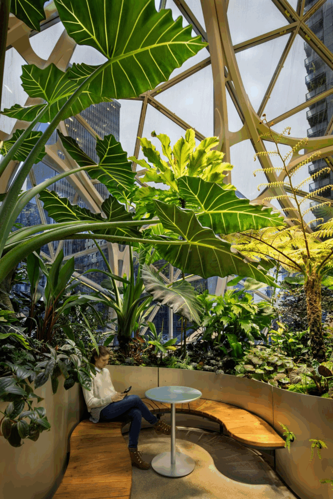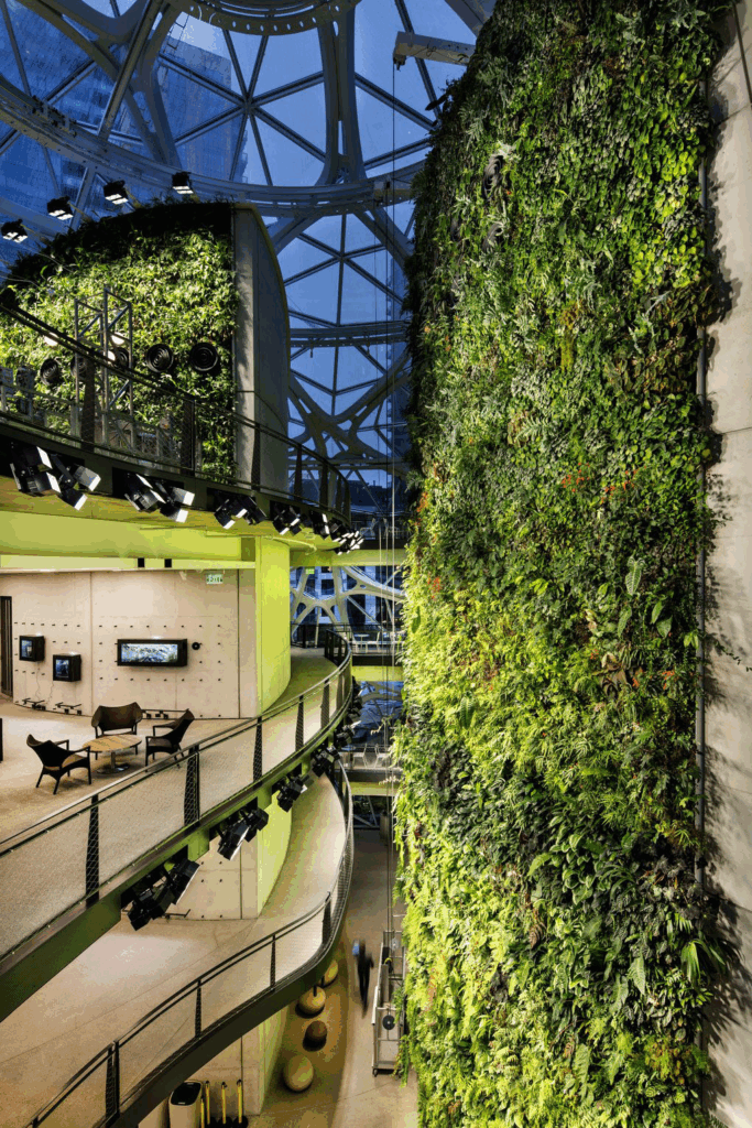 One of the highlights of The Spheres is the green wall of live plants, over 18 metre high and containing over 200 different species, that stretches vertically through the four floors of the central dome. The largest specimen at the Amazon’s headquarters is a forty-year-old 15-metre fig tree, affectionately named Rubi – it was brought from a Californian farm and then lowered into the sphere with the help of a crane.