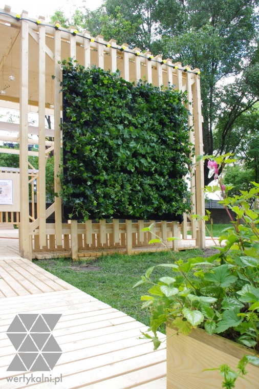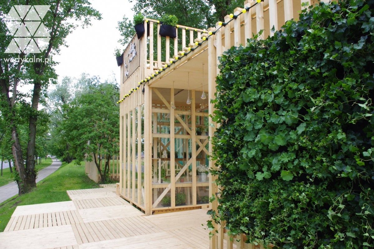 Projekt zielonej ściany dla Muzeum Powstania Warszawskiego, a dokładnie dla sąsiadującej kawiarni ‘Pokój na lato’ to było dla nas bardzo przyjemne wyzwanie projektowe. Wykonaliśmy 2 sezonowe ściany z żywych roślin, które znajdują się po obu stronach wejścia do kawiarni. Na jednej z ich pojawił się ptak wykonany ze sklejki – znak warszawskiego pawilonu kulturalno-rekreacyjnego. Na kolejnej zamontowaliśmy napis ze sklejki „Pokój na lato” przez który przebija się roślinność.