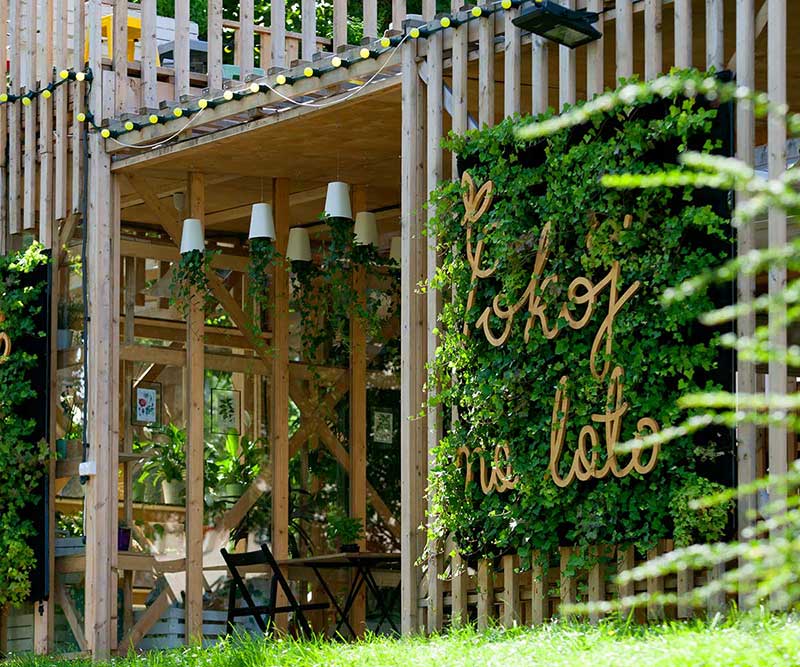 Projekt zielonej ściany dla Muzeum Powstania Warszawskiego, a dokładnie dla sąsiadującej kawiarni ‘Pokój na lato’ to było dla nas bardzo przyjemne wyzwanie projektowe. Wykonaliśmy 2 sezonowe ściany z żywych roślin, które znajdują się po obu stronach wejścia do kawiarni. Na jednej z ich pojawił się ptak wykonany ze sklejki – znak warszawskiego pawilonu kulturalno-rekreacyjnego. Na kolejnej zamontowaliśmy napis ze sklejki „Pokój na lato” przez który przebija się roślinność.